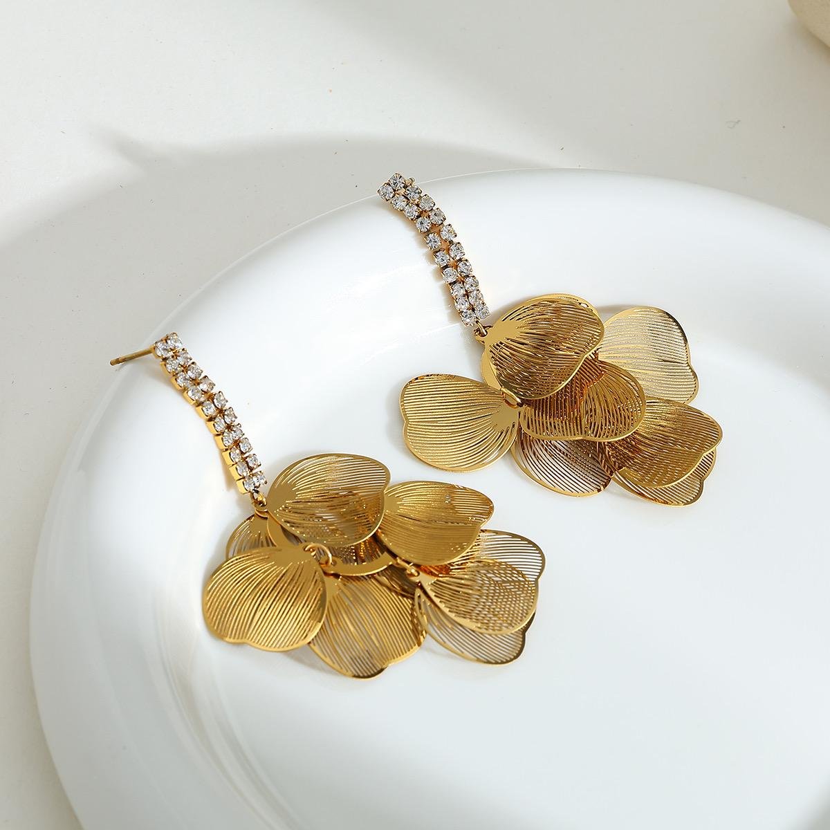 Aretes largos petalos circonias acero inoxidable chapados en oro de 18k