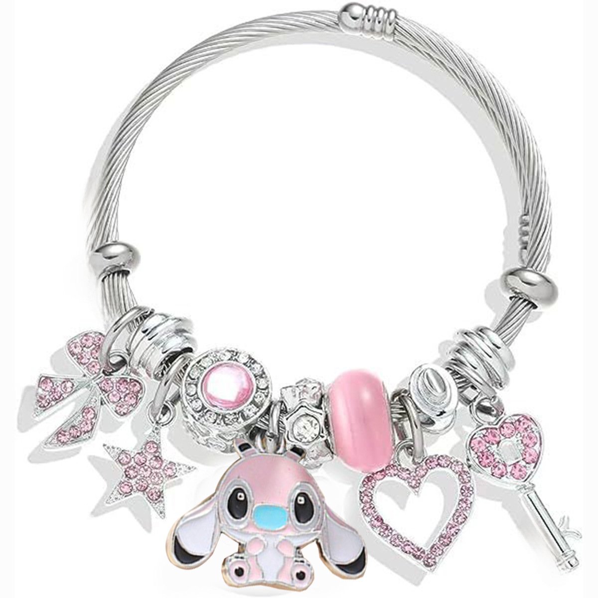 Pulsera Plateada Lilo y Stich rosa acero inoxidable charms de aleacion cantidad